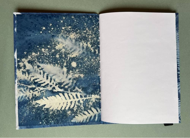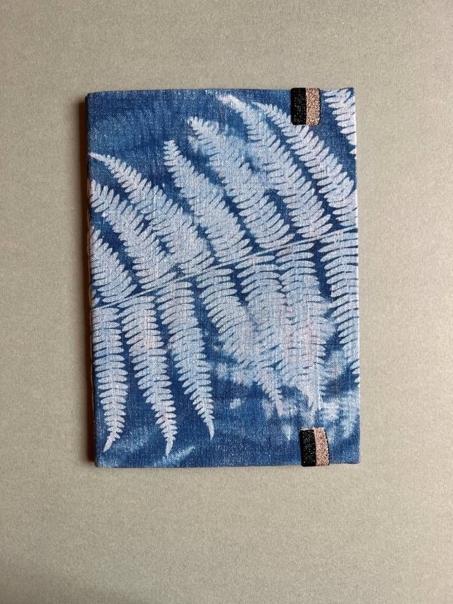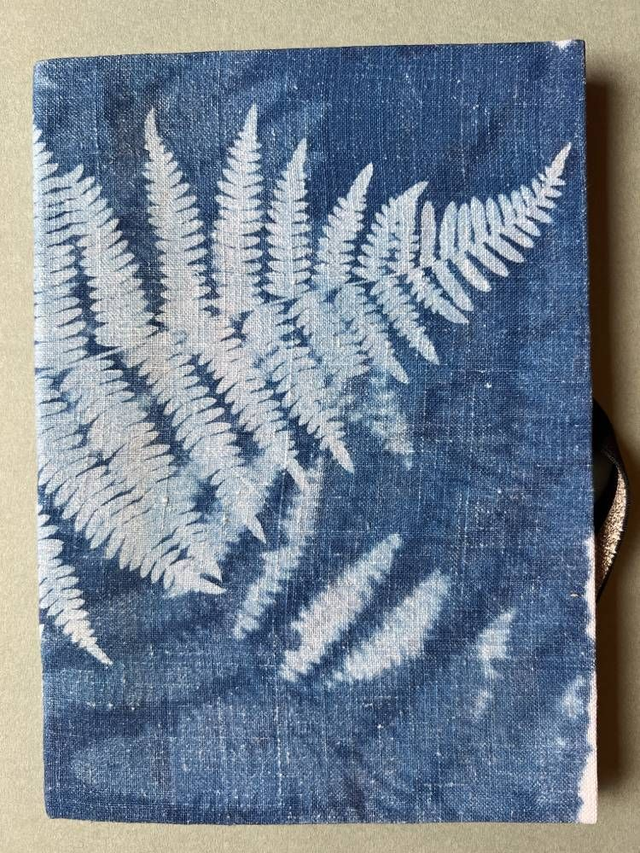 Un carnet où écrire ses pensées, avec une couverture en tissu réalisée en cyanotype et une reliure cousue main. Une pièce artisanale originale, parfaite pour noter vos idées.